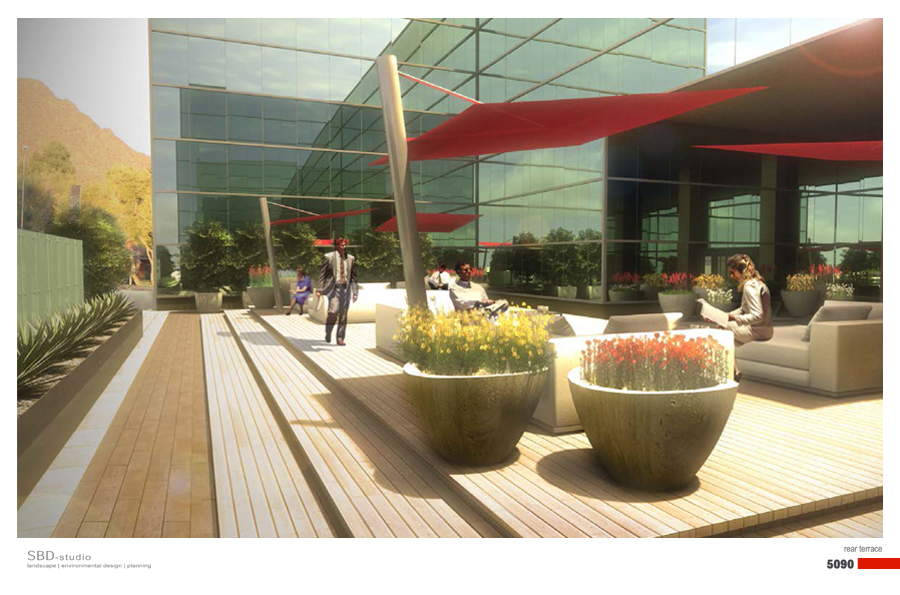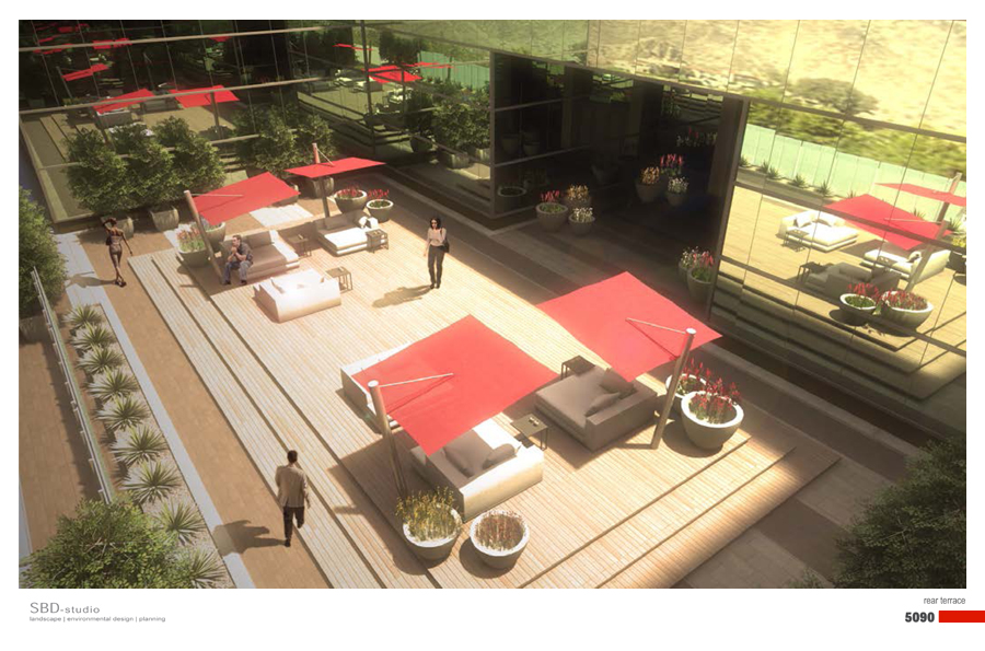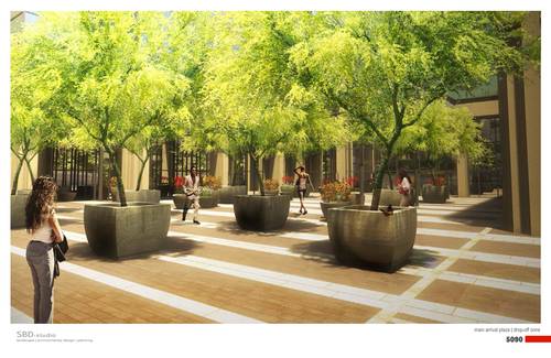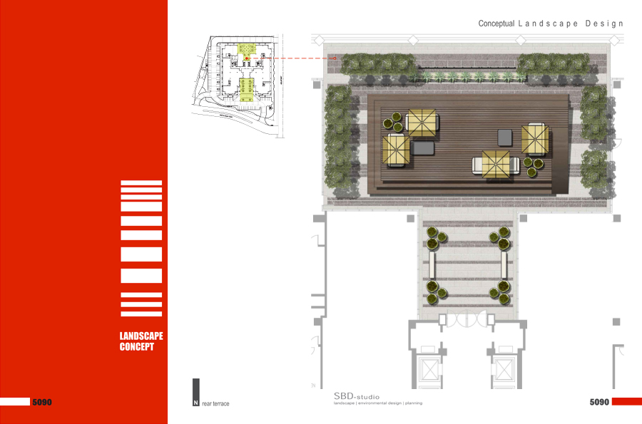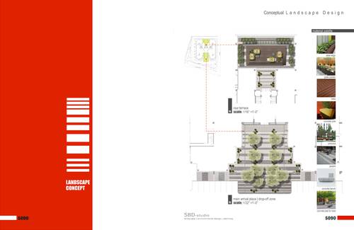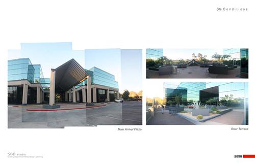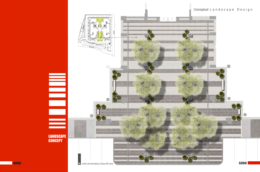 The proposed new landscape concepts for both, the main arrival plaza / drop-off zone and the rear terrace work together to transform a rather static and sterile composition of geometries and outdoor elements into a dynamic and playful garden composition. Both strategies work to amplify the experience of place and both are inviting to encourage visitation.