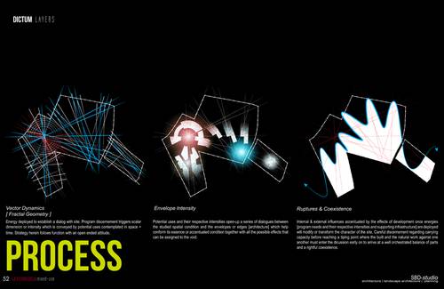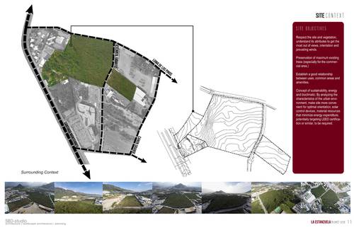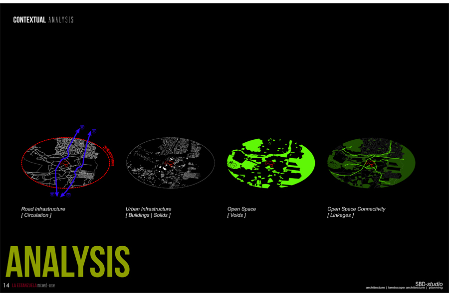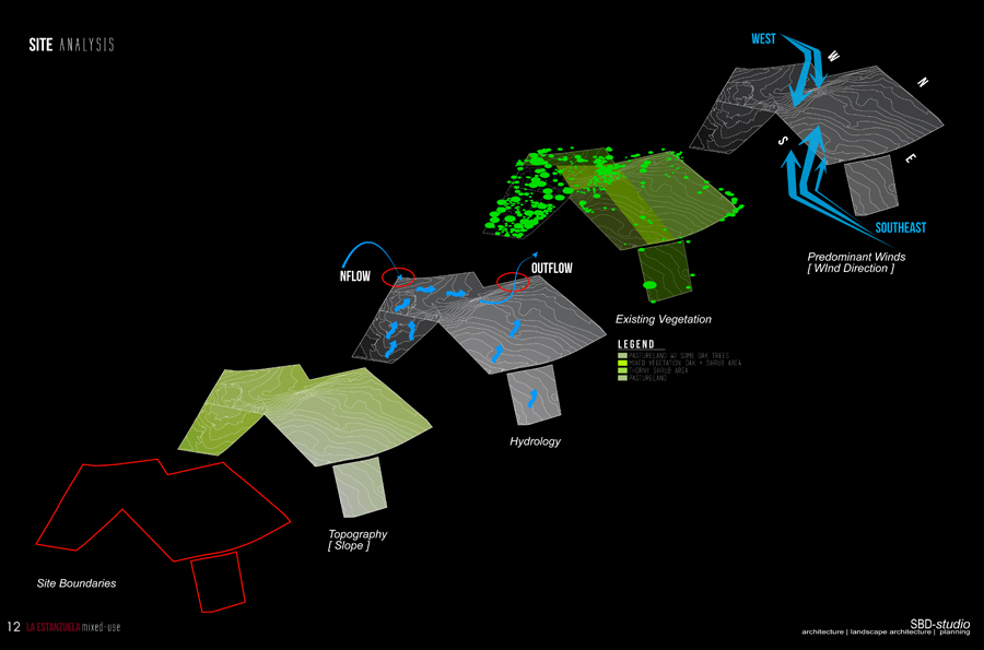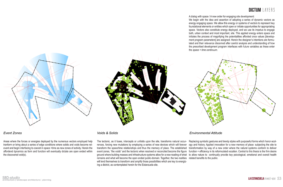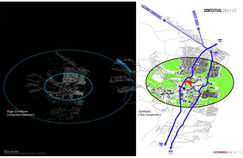 The masterplan of La Estenzuela developed from the idea and assertion of adopting a series of dynamic vectors as energy engaging space. We allow this energy or systems of vectors to represent key foundational elements or entities which open or initiate opportunities for appropriating space. These vectors also constitute energy deployed, and are utilized to engage both, urban context and most important, site. This applied energy enters space and initiates the process of magnifying the potentialities afforded once values [development program parameters] are assigned.
