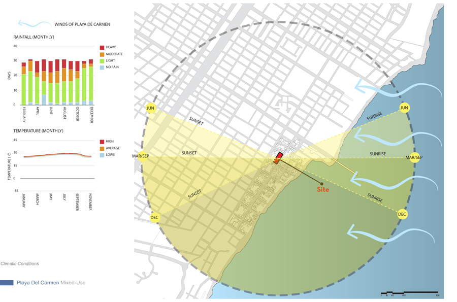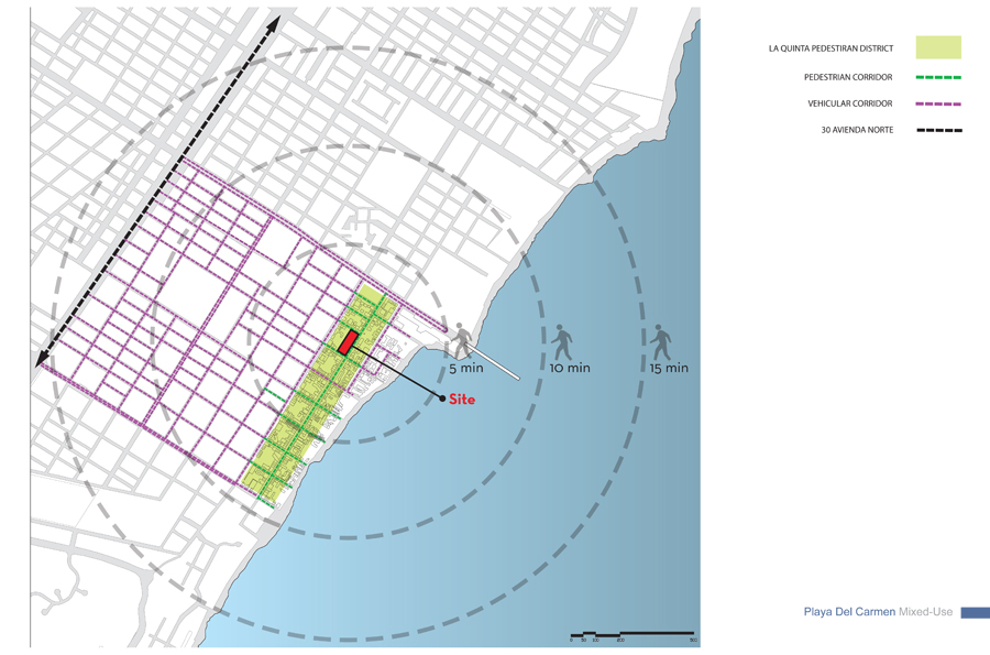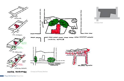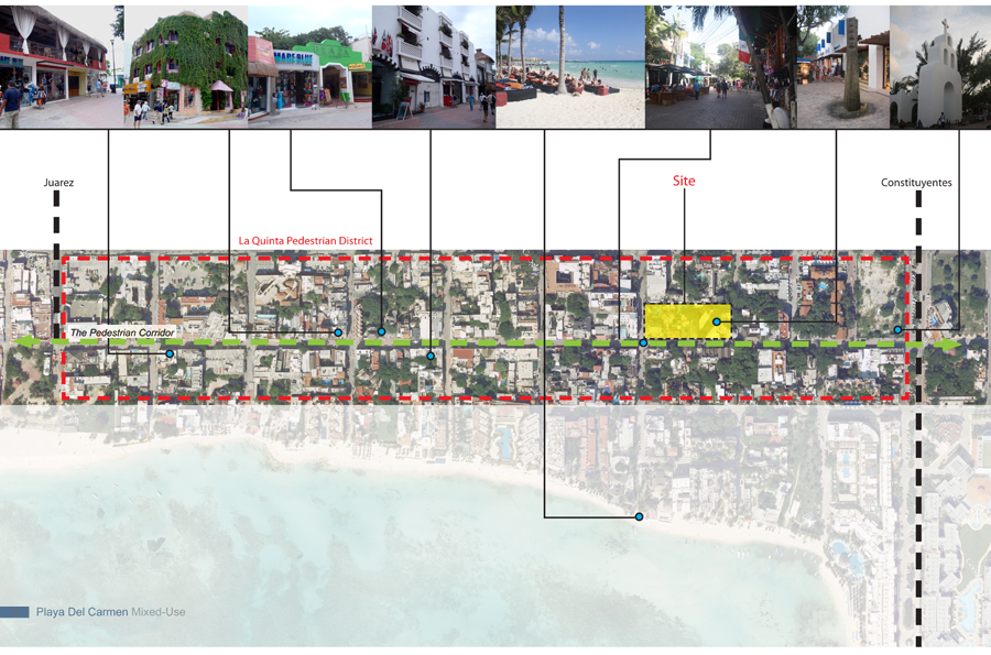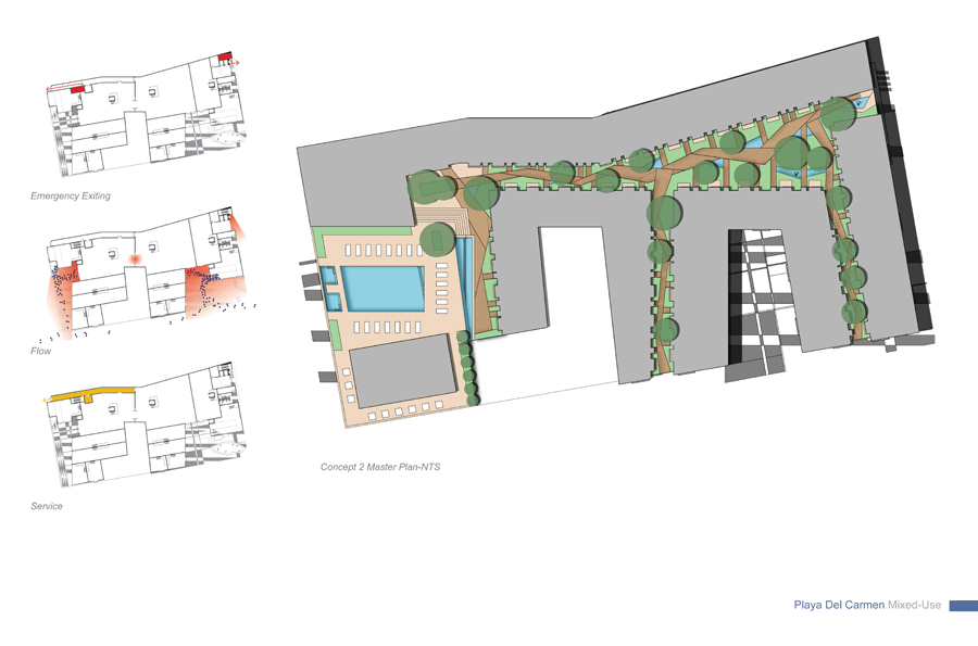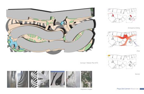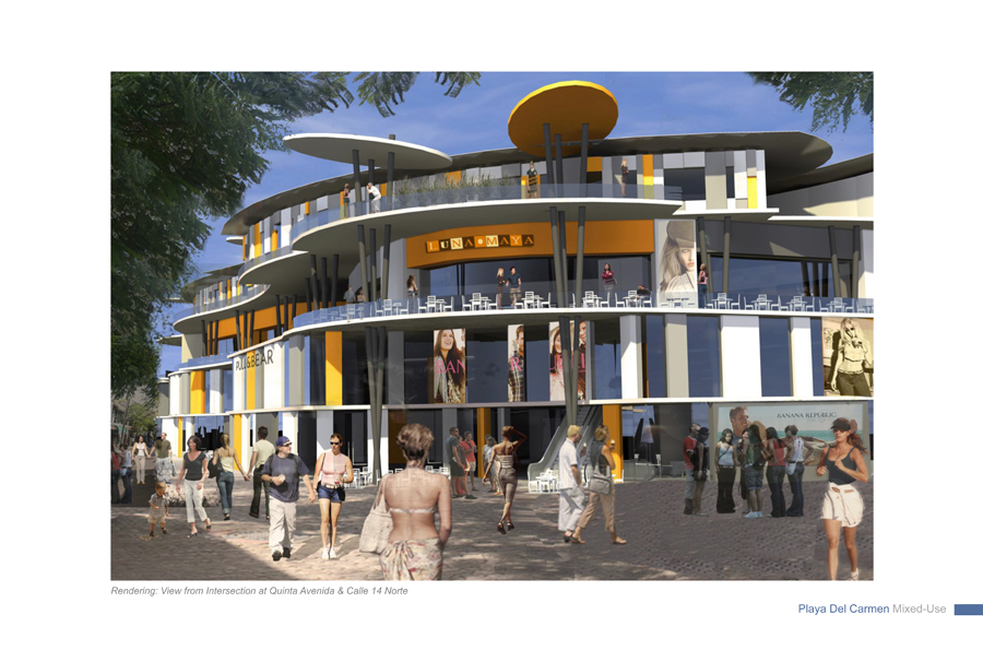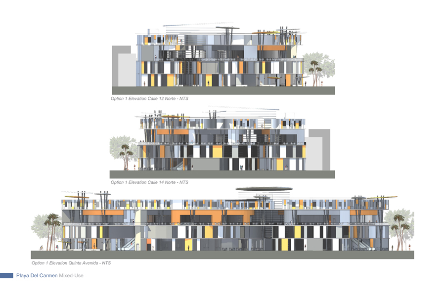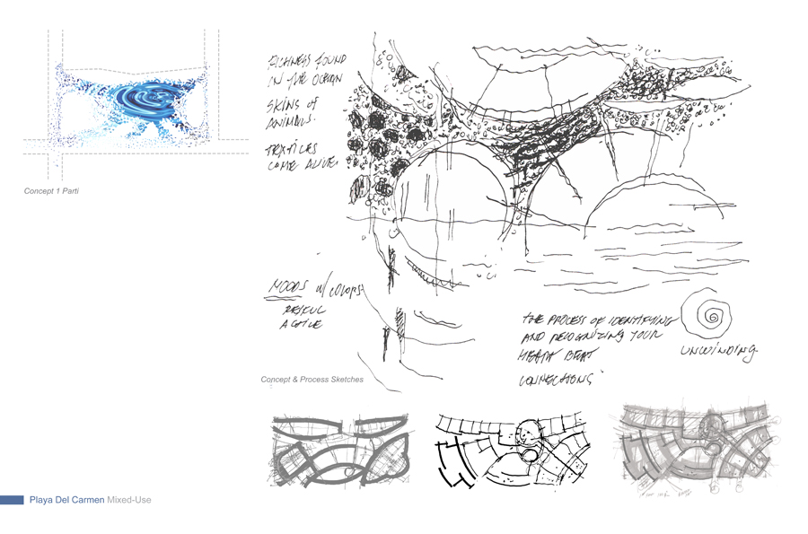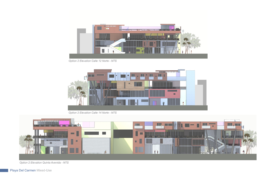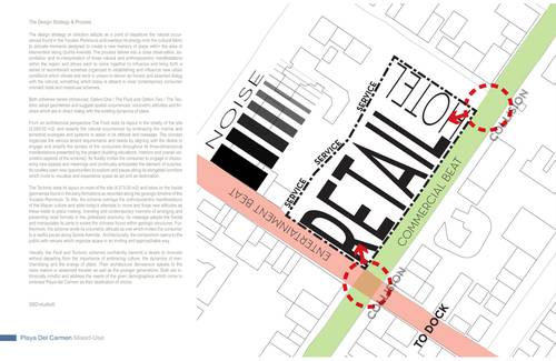The design strategy or direction adopts as a point of departure the natural occurrences found in the Yucatan Peninsula and overlays its energy onto the cultural fabric to activate moments designed to create a new memory of place within the area of intervention along Quinta Avenida. The process delves into a close observation, as-similation and re-interpretation of those natural and anthropocentric manifestations within the region and allows each to come together to influence and bring forth a series of recombinant schemes organized to establishing and influence new urban conditions which vibrate and work in unison to deliver an honest and asserted dialog with the natural; something which today is absent in most contemporary consumer oriented retail and mixed-use schemes. Both schemes herein introduced; Option-One / The Fluid and Option-Two / The Tectonic adopt geometries and suggest spatial occurrences, volumetric attitudes and finishes which are in direct dialog with the existing dynamics of place.