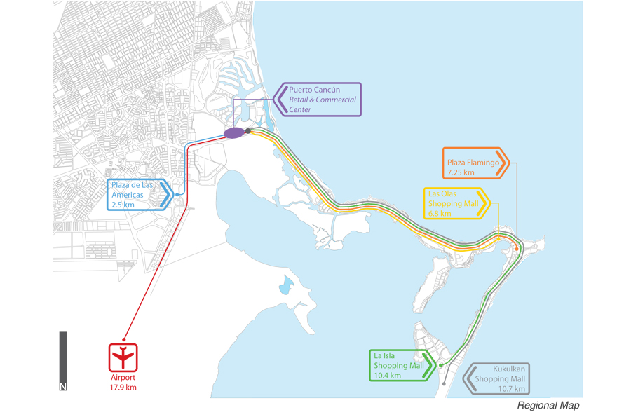 The proposed Commercial / Retail development concept for ‘Puerto Cancún’ rests on building a case based on establishing a refreshing new reality within this resort destination, and capable at the same time of responding and stimulating current and future demands in the local real estate market. The specific land uses and their distribution, as organized within the project’s urban design framework, recognize that the commercial / retail building market is increasingly becoming more competitive in terms of design, architecture, and sustainability. For this reason, the need for radically improved strategies which continually create and strengthen whole communities firmly committed to place and environment is crucial.