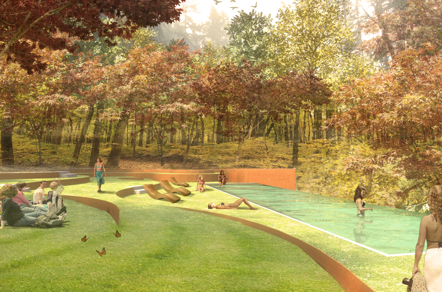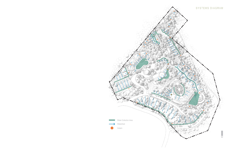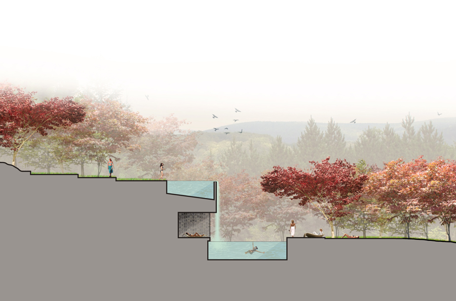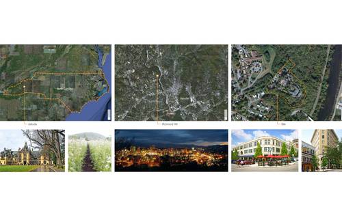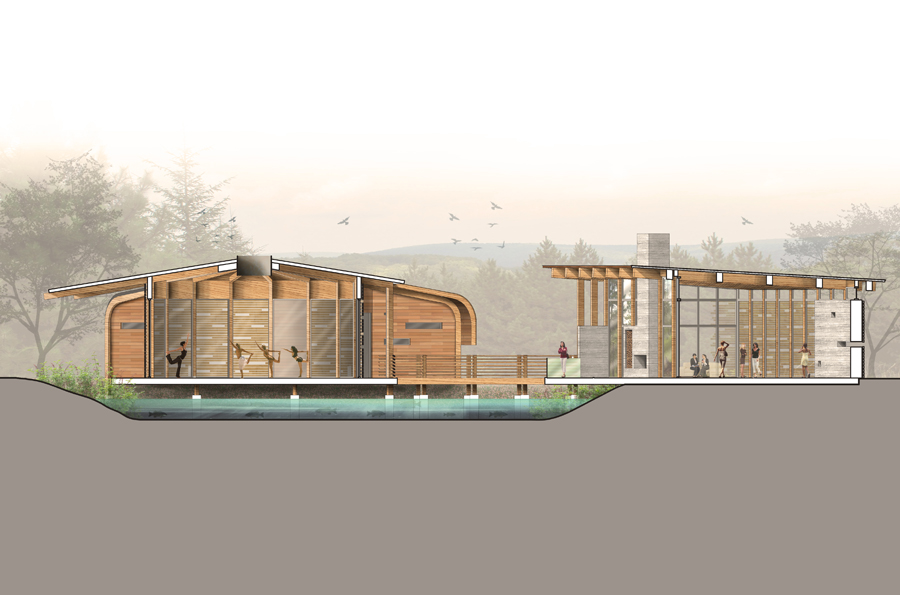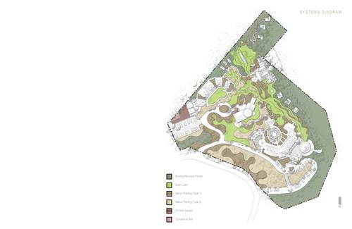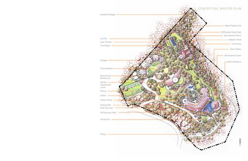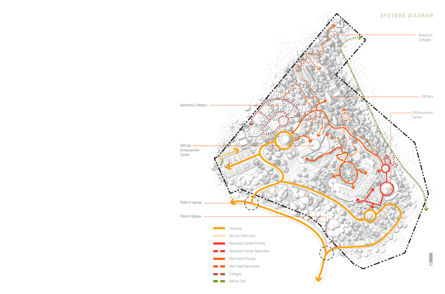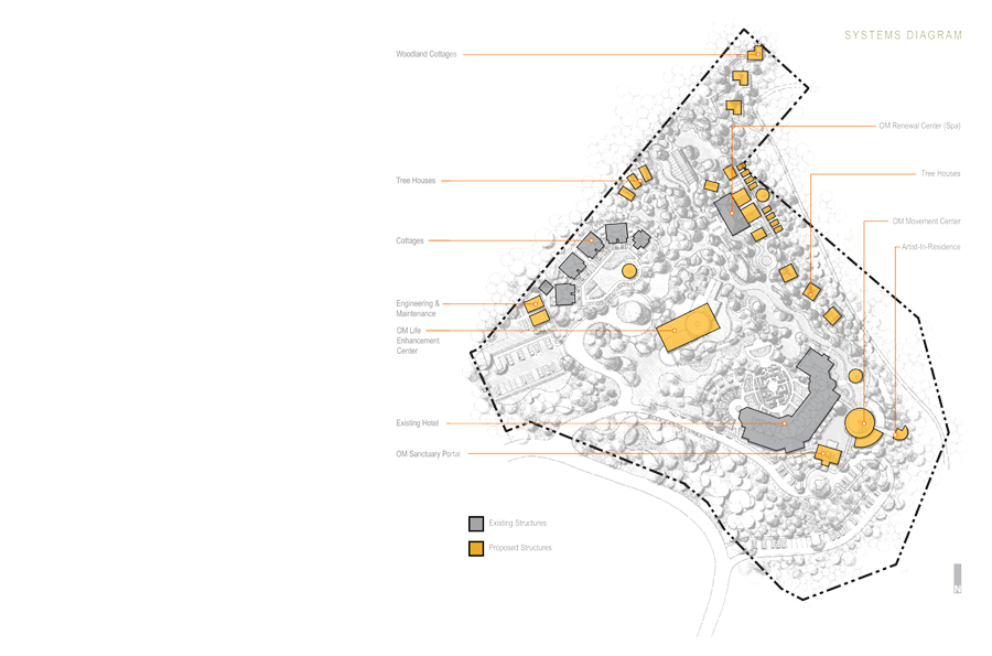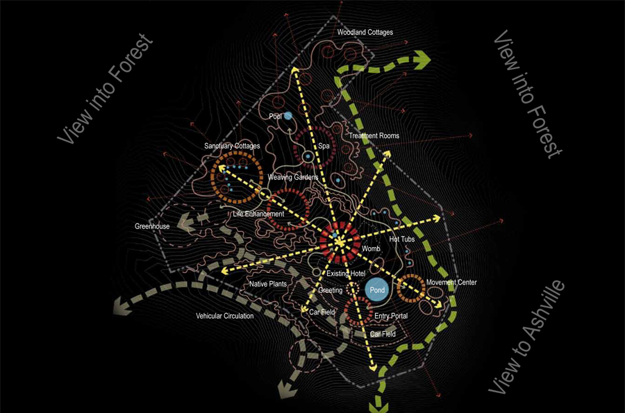 The OM Sanctuary is situated on Richmond Hill in western Asheville, North Carolina. The proposed landscape vision for OM-Sanctuary adopts methods, ideas and principles that convey a deeply rooted commitment to the planning and design of an open space armature centered on re-establishing a long forgotten connection to the natural environment. Before the rise of Asheville, an ancient people once roamed the mountains of western North Carolina. Finely crafted stone tools and spear-points confirm that the area of present day Asheville was inhabited more than 11,000 years ago. The Cherokee lifestyles were defined by harmony with nature, sustainability, personal freedom, and a balance between work and play. Landscape related improvements to the existing grounds, as well as proposed interventions will capitalize on deriving meaning based on the site’s geomorphology, climate, local culture, traditions, ecology and overall sense of place. Through the use of sustainable systems, plantings and materials native to the Appalachian region, and architecture inspired by the Cherokee who once inhabited these mountains, OM Sanctuary will create an experience of holistic healing for self and place that will have a lasting beauty and memory.