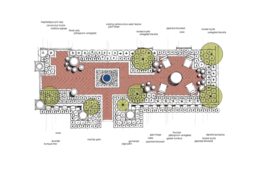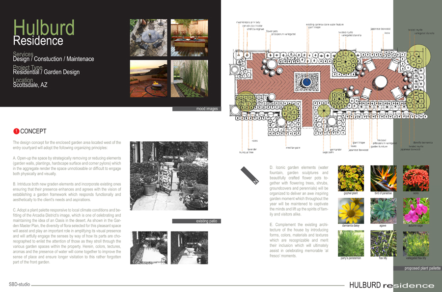 The design concept for the enclosed garden area located west of the entry courtyard will adopt the following organizing principles: A. Open-up the space by strategically removing or reducing elements which in the aggregate render the space unnoticeable or difficult to engage both physically and visually. B. Introduce both new garden elements and incorporate existing ones ensuring that their presence enhances and agrees with the vision of establishing a garden framework C. Adopt a plant palette responsive to local climate conditions and befitting of the Arcadia District’s image, celebrating and maintaining the idea of an Oasis in the desert. D. Iconic garden elements will be organized to deliver an awe inspiring garden moment E. Complement the existing architecture of the house by introducing forms, colors, materials and textures which merit their inclusion assisting in celebrating memorable ‘al fresco’ moments.