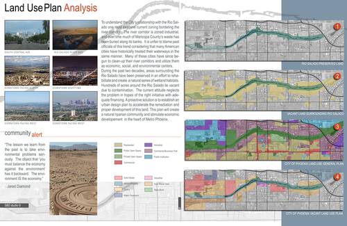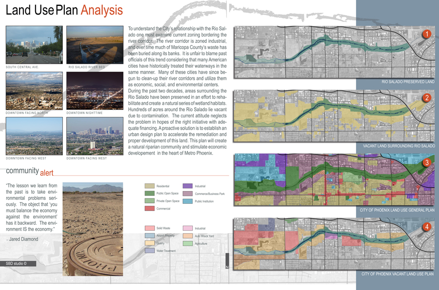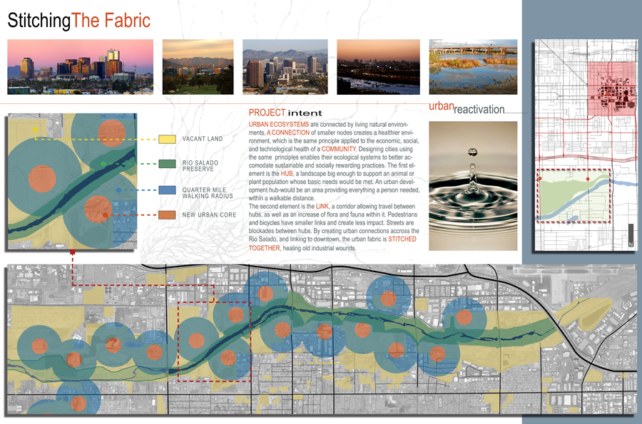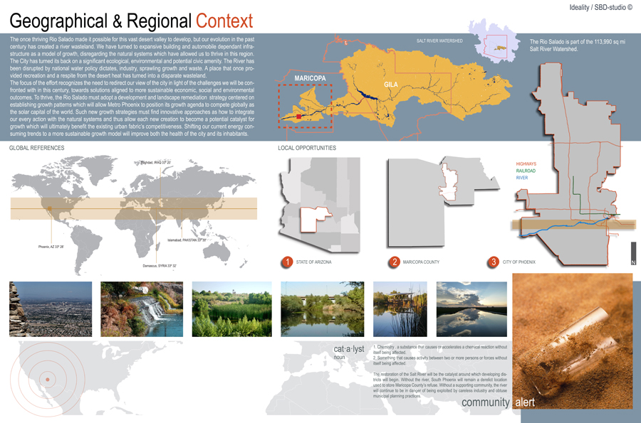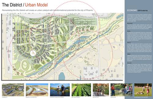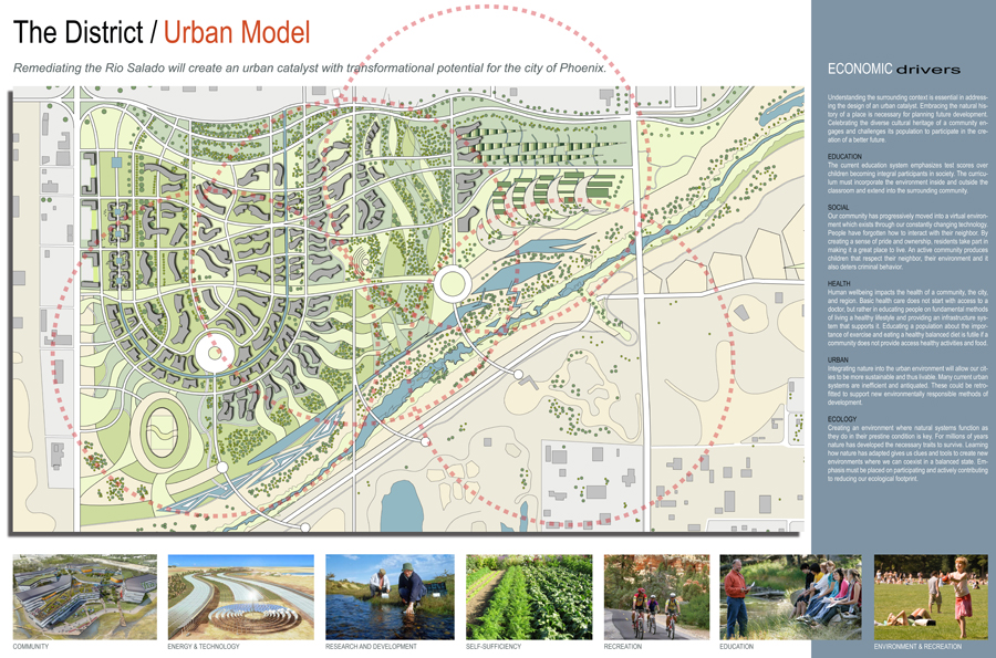 The once thriving Rio Salado made it possible for this vast desert valley to develop, but our evolution in the past century has created a river wasteland. The focus of the effort recognizes the need to redirect our view of the city in light of the challenges we will be confronted with in this century, towards solutions aligned to more sustainable economic, social and environmental outcomes. To thrive, the Rio Salado must adopt a development and landscape remediation strategy centered on establishing growth patterns which will allow Metro Phoenix to position its growth agenda to compete globally as the solar capital of the world. Such new growth strategies must find innovative approaches as how to integrate our every action with the natural systems and thus allow each new creation to become a potential catalyst for growth which will ultimately benefit the existing urban fabric’s competitiveness. Shifting our current energy consuming trends to a more sustainable growth model will improve both the health of the city and its inhabitants.